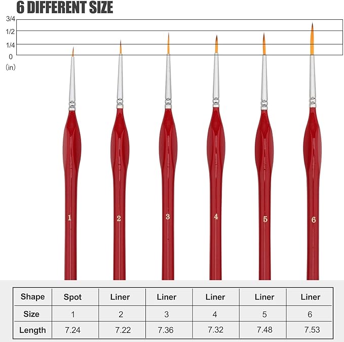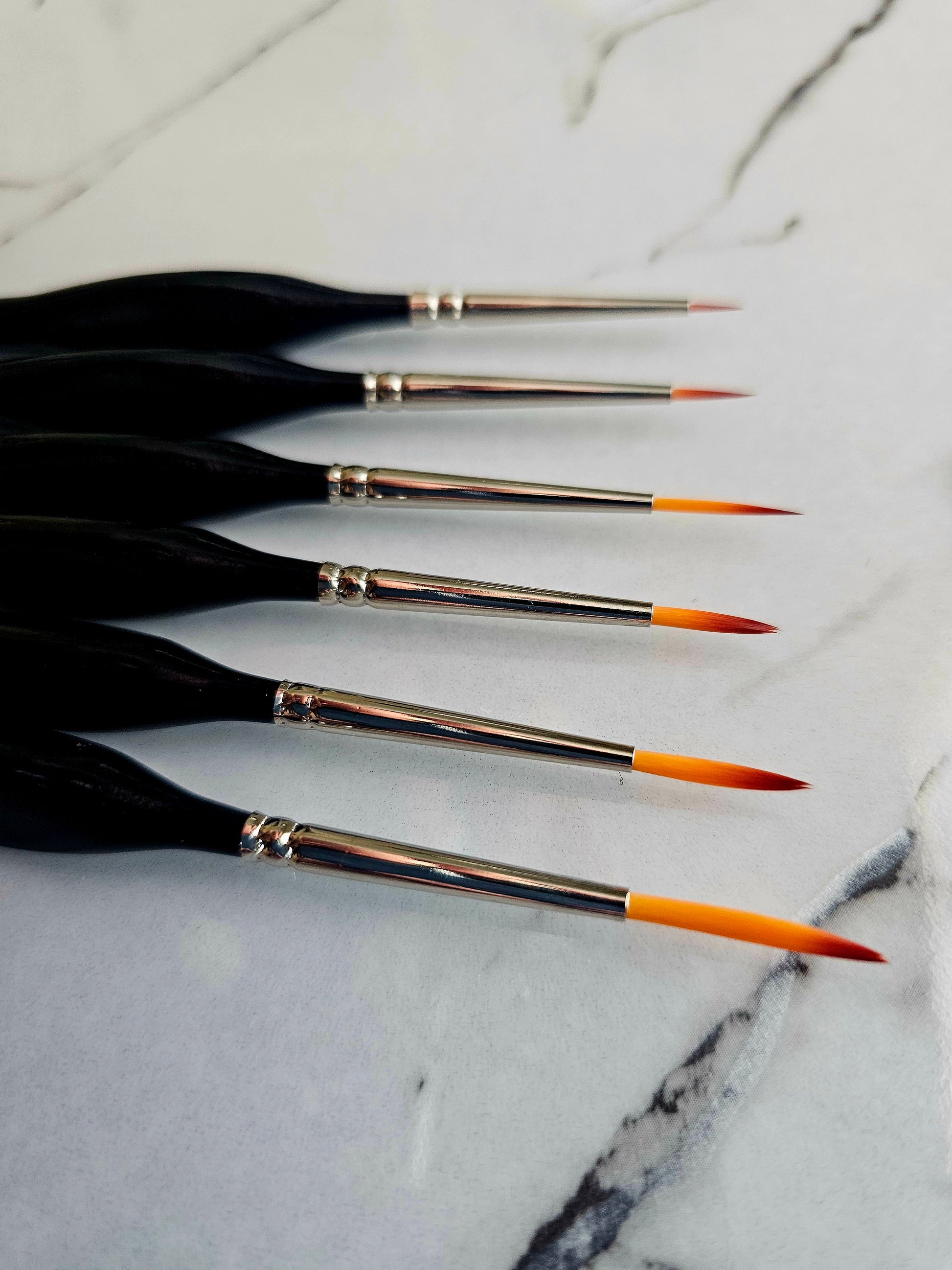 Get swooshing with these 6 pc Nylon fine detail brushes! Perfect for any medium - acrylic, watercolor, enamel, oil, and gouache paints. Designed with durable anti-shedding bristles & anti-rust ferrules, and sturdy wooden handles for precision strokes. The soft, thick nylon hairs ensure smooth brushwork.