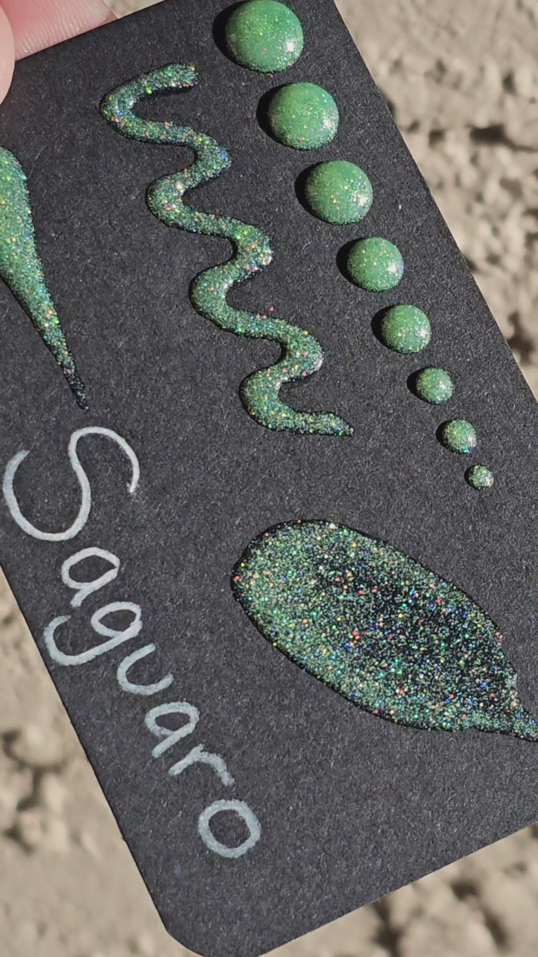 Saguaro is my all-time favorite green paint because of its texture, hue and shimmer. It adds eye-catching sparkle to my pieces, and looks as though I have actually added emeralds to my work. Photos and videos don't represent its true beauty -- it really is a paint to be seen in-person. Whether I use it flat (as a layer of shimmer), or in 3D, Saguaro is my GO-TO-GREEN. All of the Deserted Bliss products are equally as astounding -- they are truly the creme de la creme of acrylic paints.