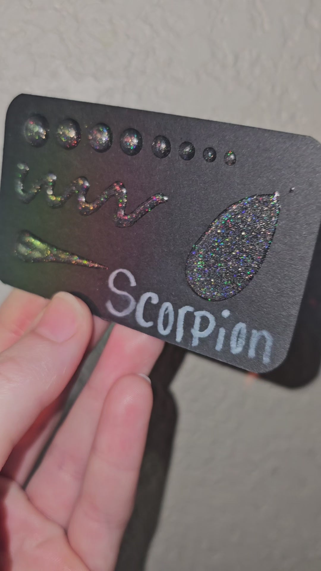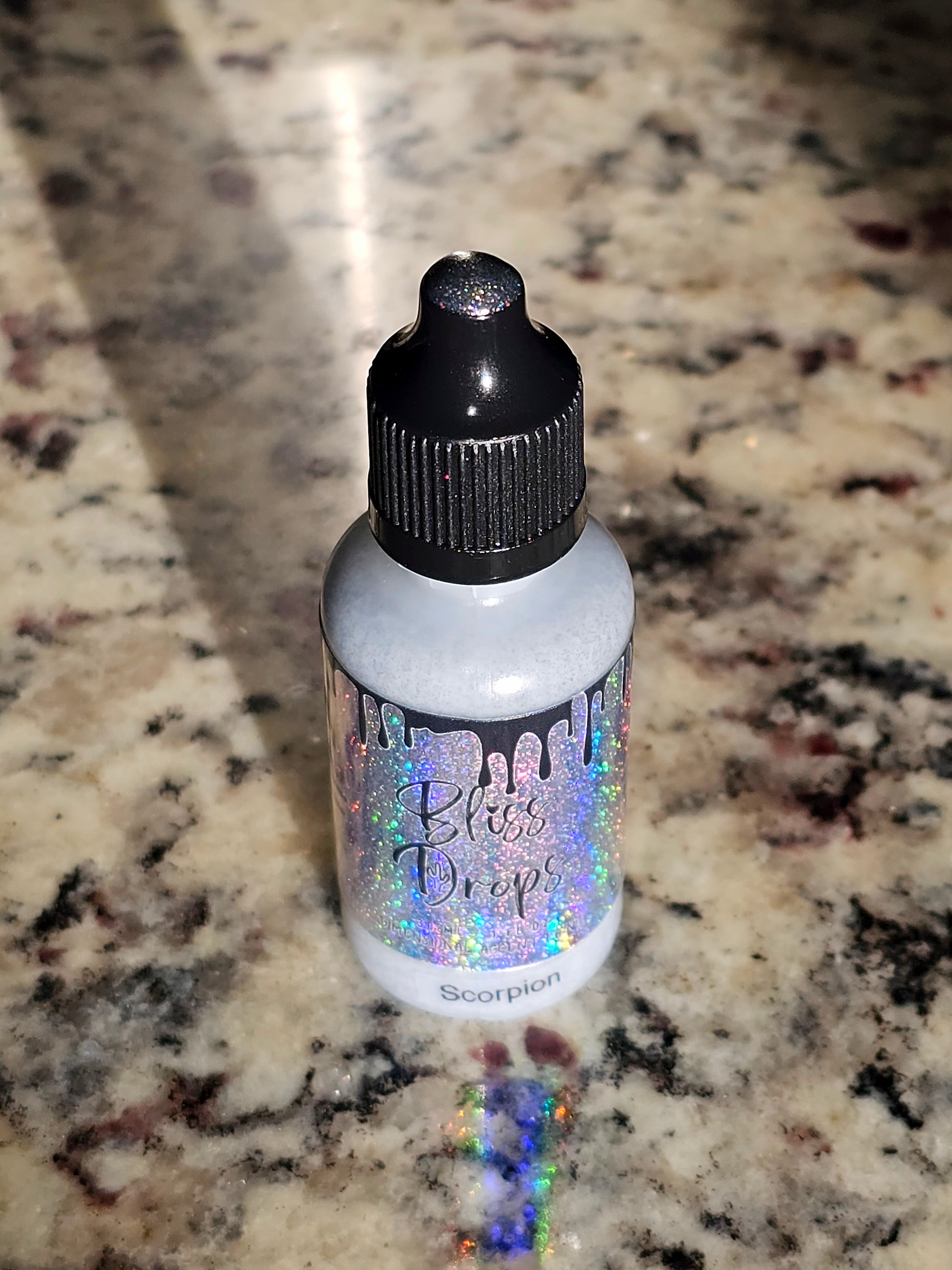 Get ready to add a little sparkle to your life with Bliss Drops - Shimmer Series - Scorpion! This unique acrylic paint features charcoal black with holographic sparkles, giving off a mesmerizing gold and black shimmer in different lighting. Say goodbye to basic, and hello to a touch of glamour! Scorpion got its name because in its desert climate, Arizona is home to a few prominent scorpions.