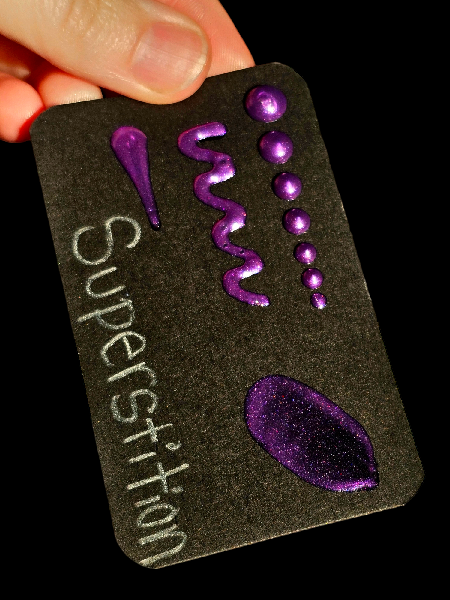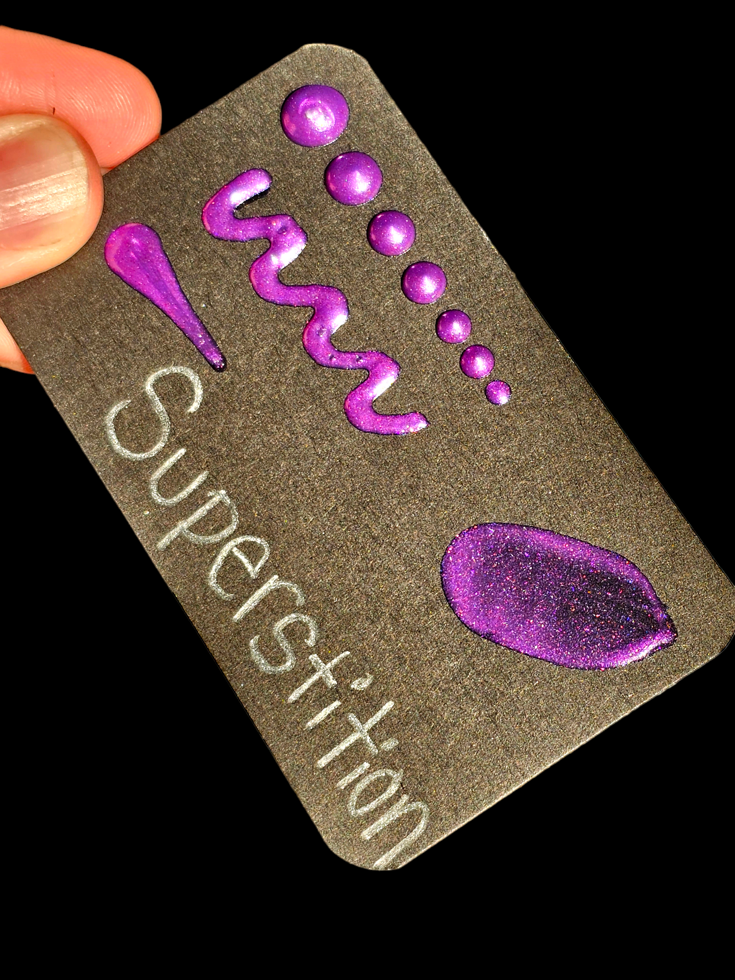 Superstition is full of mystical shimmer, with a pearly purple hue and hints of red sparkle. Named after the Superstition Mountains in Arizona. The Superstition Mountains lie east of Phoenix in the federally designated Superstition Wilderness Area, which encompasses approximately 160,000 acres of rugged desert. Jutting up suddenly from the desert floor, the mountains cast eerie shadows, making quite an impression on those who see them.