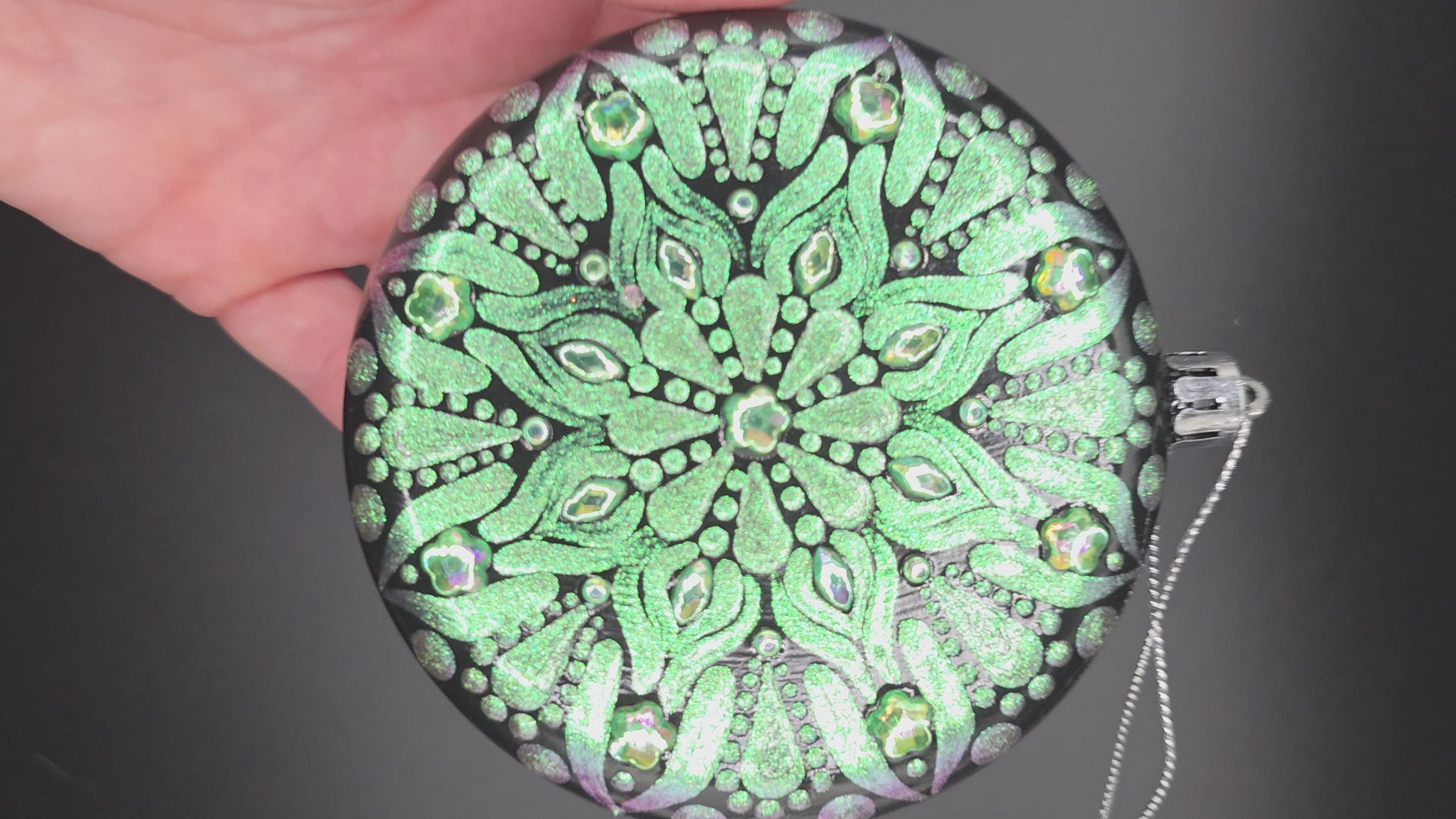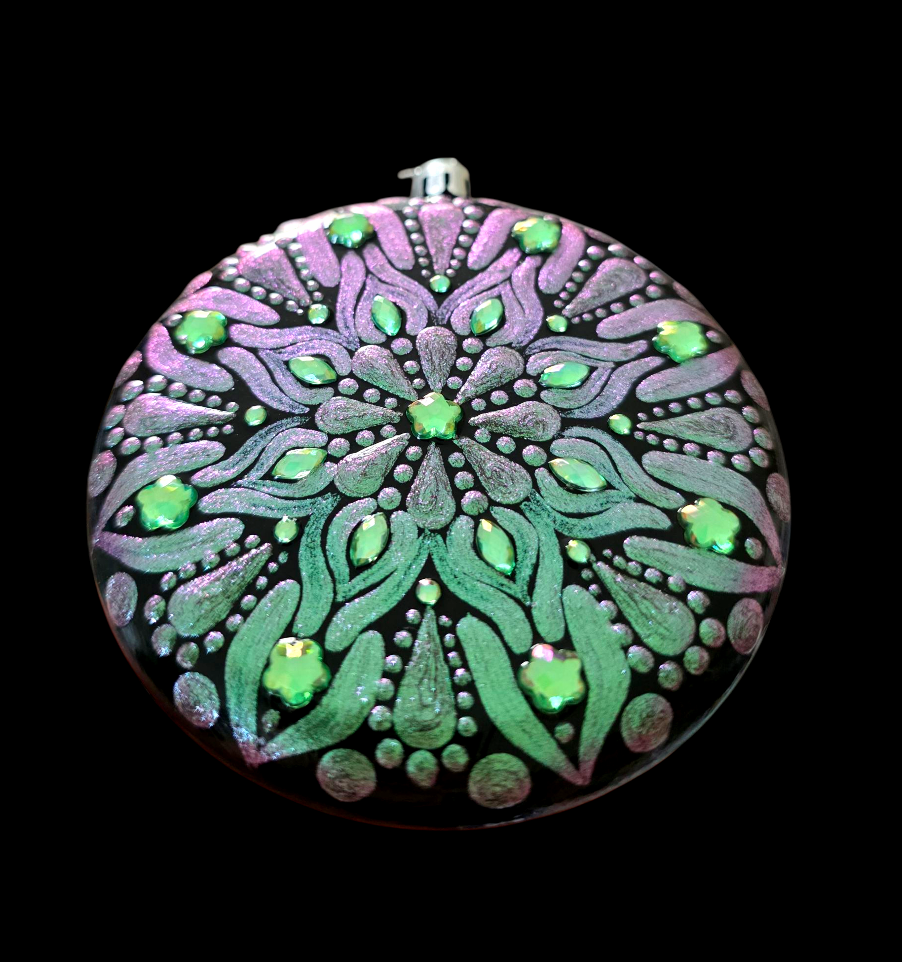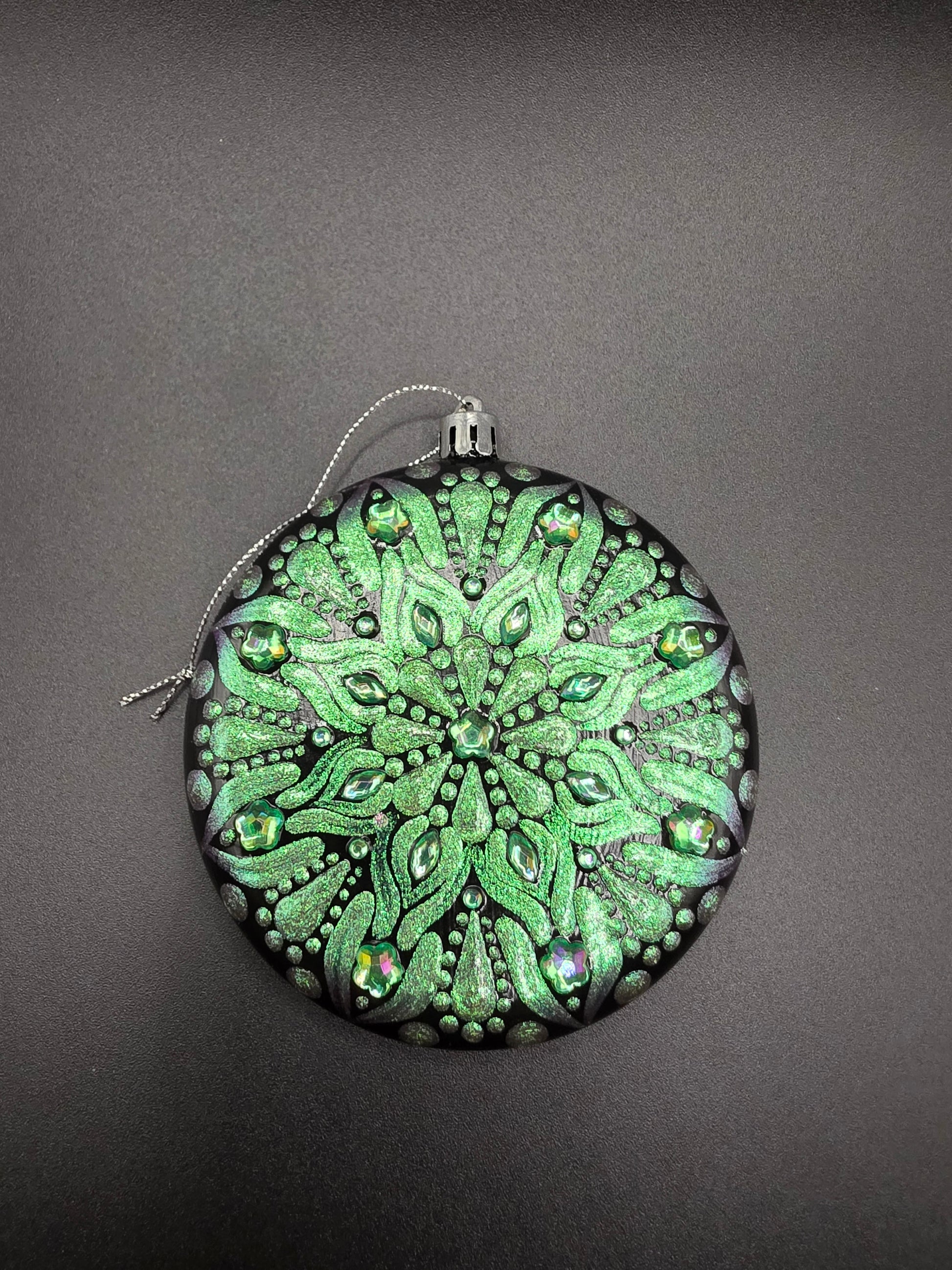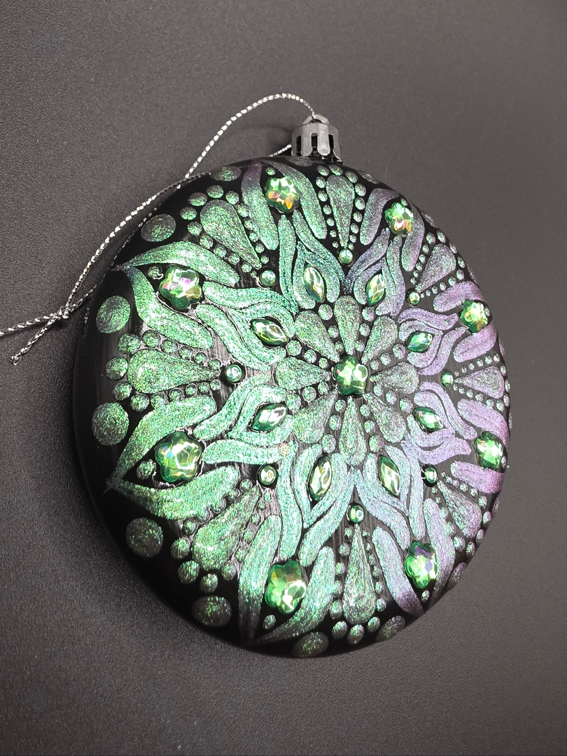 This Colorshift Rhinestone Ornament features a unique one-sided design with a striking green-purple shift PDA paint finish, enhanced by sparkling rhinestones. Crafted from durable plastic and sealed with varnish, it offers lasting vibrancy and resistance to breakage, making it an elegant and resilient decorative piece.