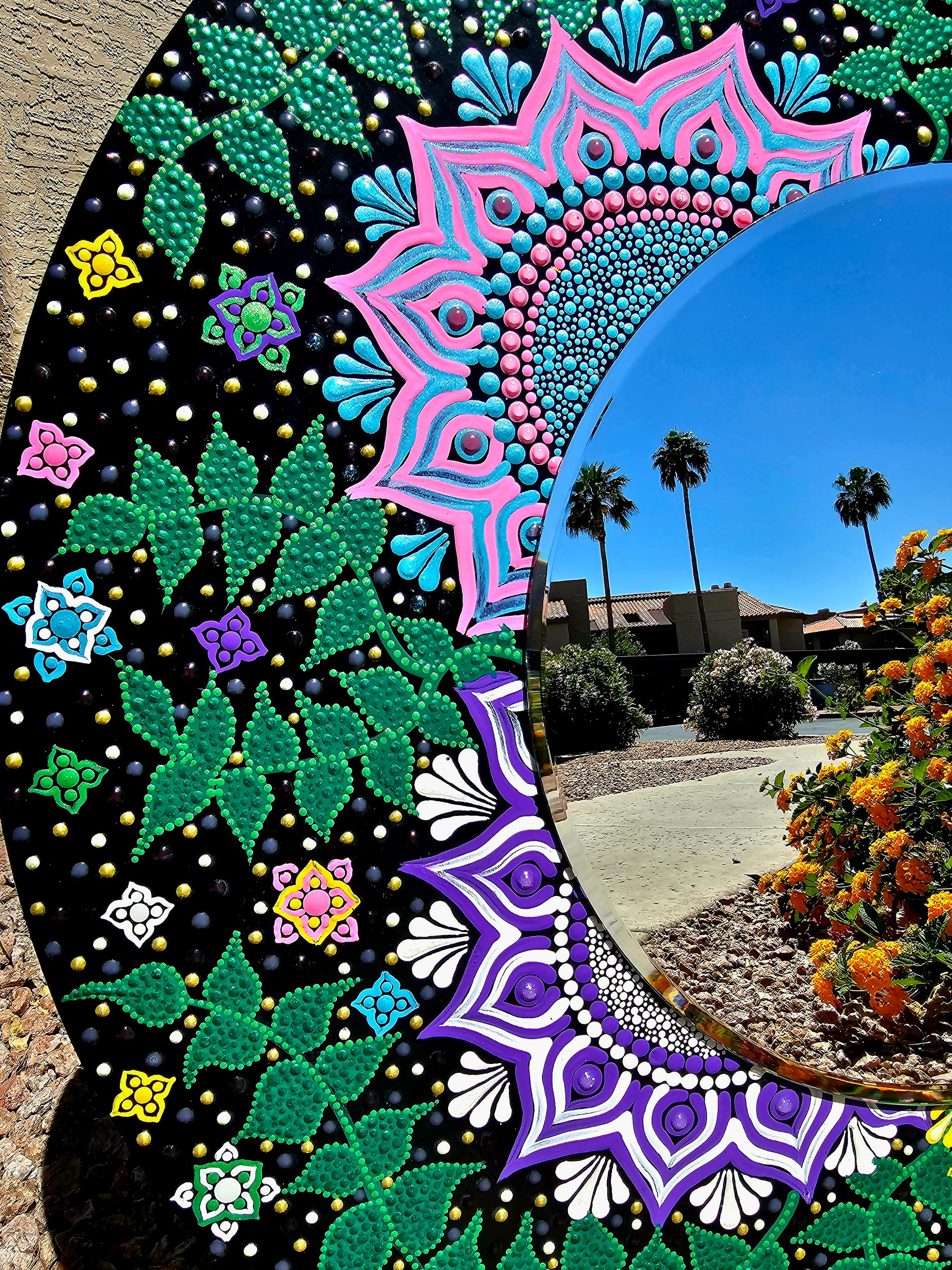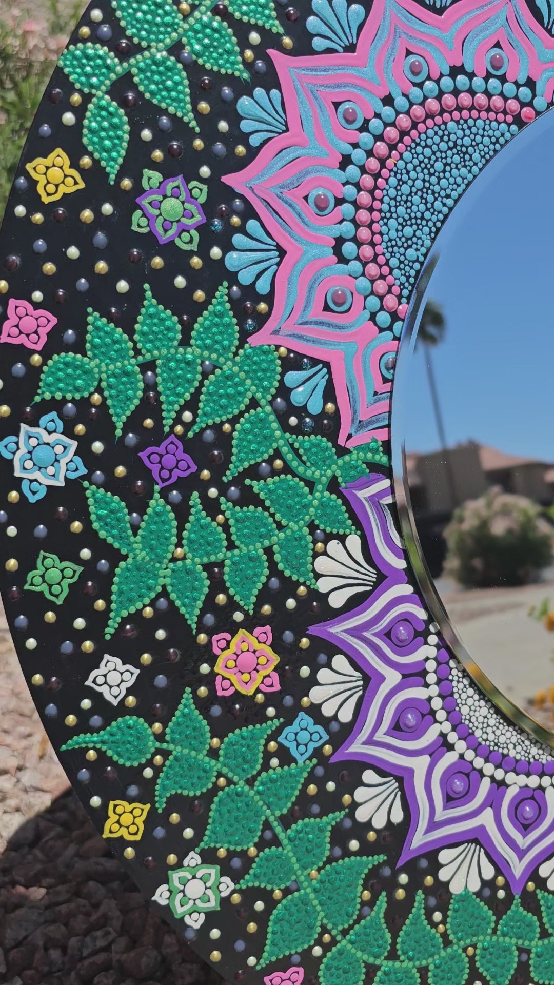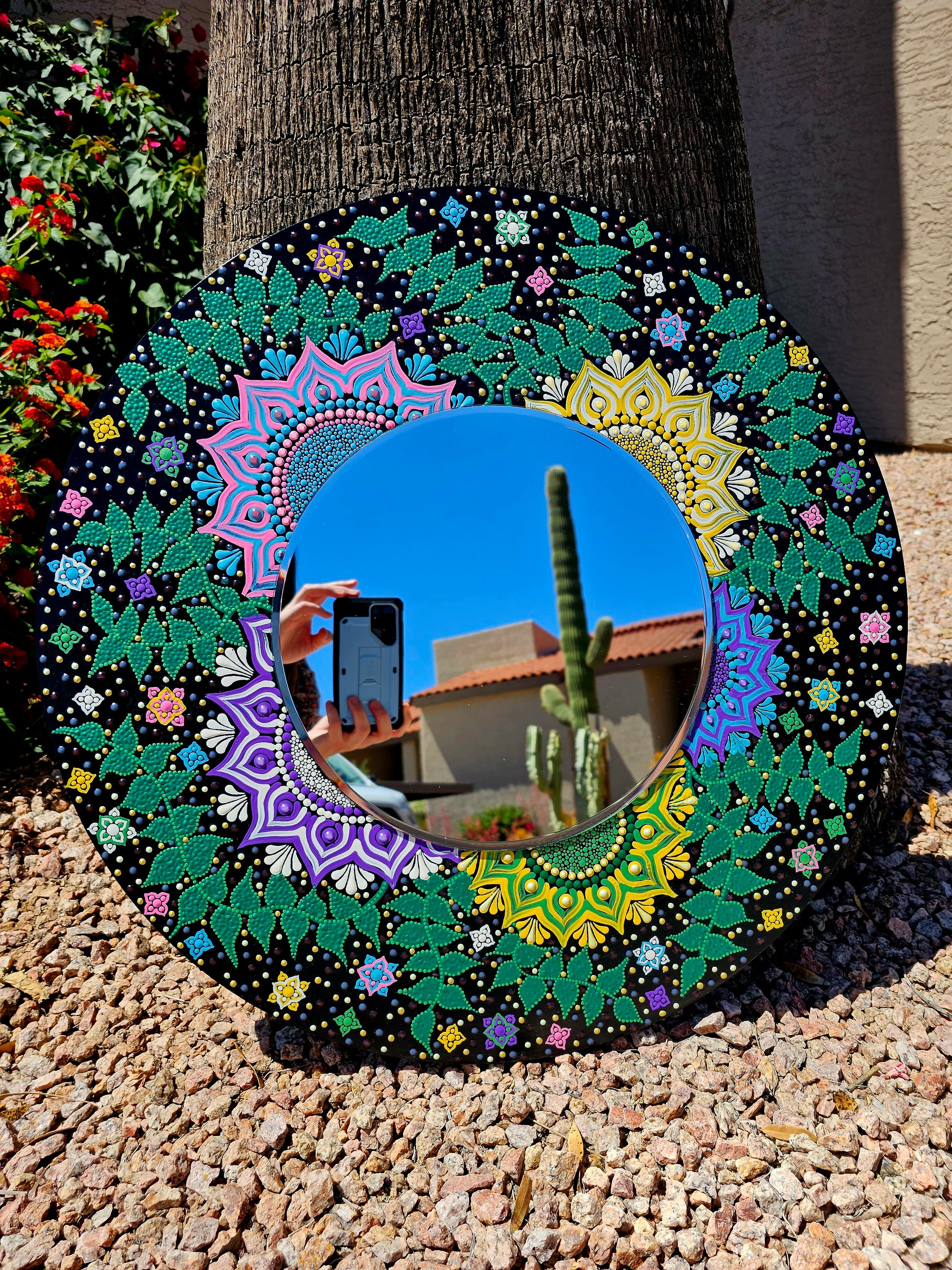 This beautiful, unique 24 inch mirror is a perfect home decoration! Featuring a floral dot painting on a 1/2 inch thick piece of birch wood, it adds a touch of character and playfulness to any room. This one-of-a-kind piece will bring a vivid pop of personality to any space!