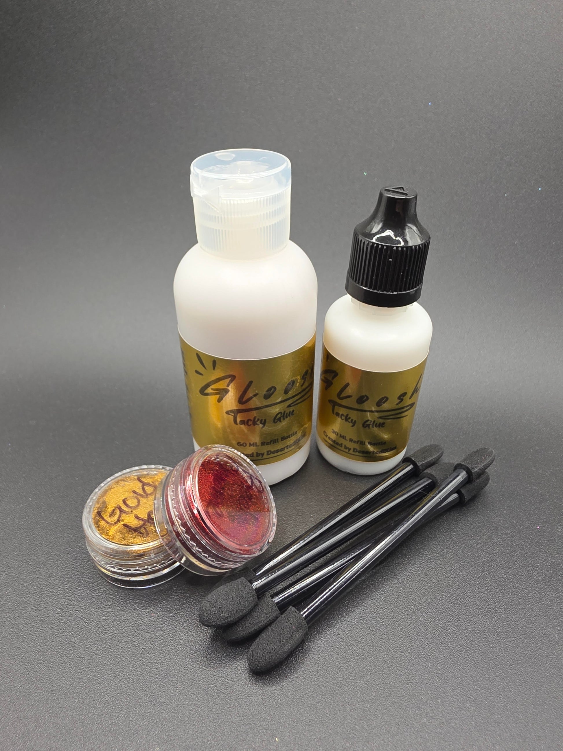The Gloosh Bundle offers everything you need to create stunning, shimmering effects. It includes a 30ml fine tip bottle for precise application and a larger 60ml bottle for generous use. You'll also receive 2 grams of randomly selected mica to add a unique sparkle, plus 4 applicators to make your creative process effortless. Perfect for artists and crafters looking to elevate their projects with ease and style.
