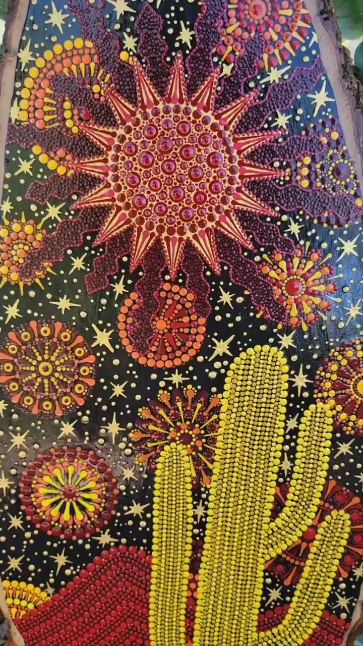 Made with acrylic paint and then coated with varnish to add shine and protect the painting.