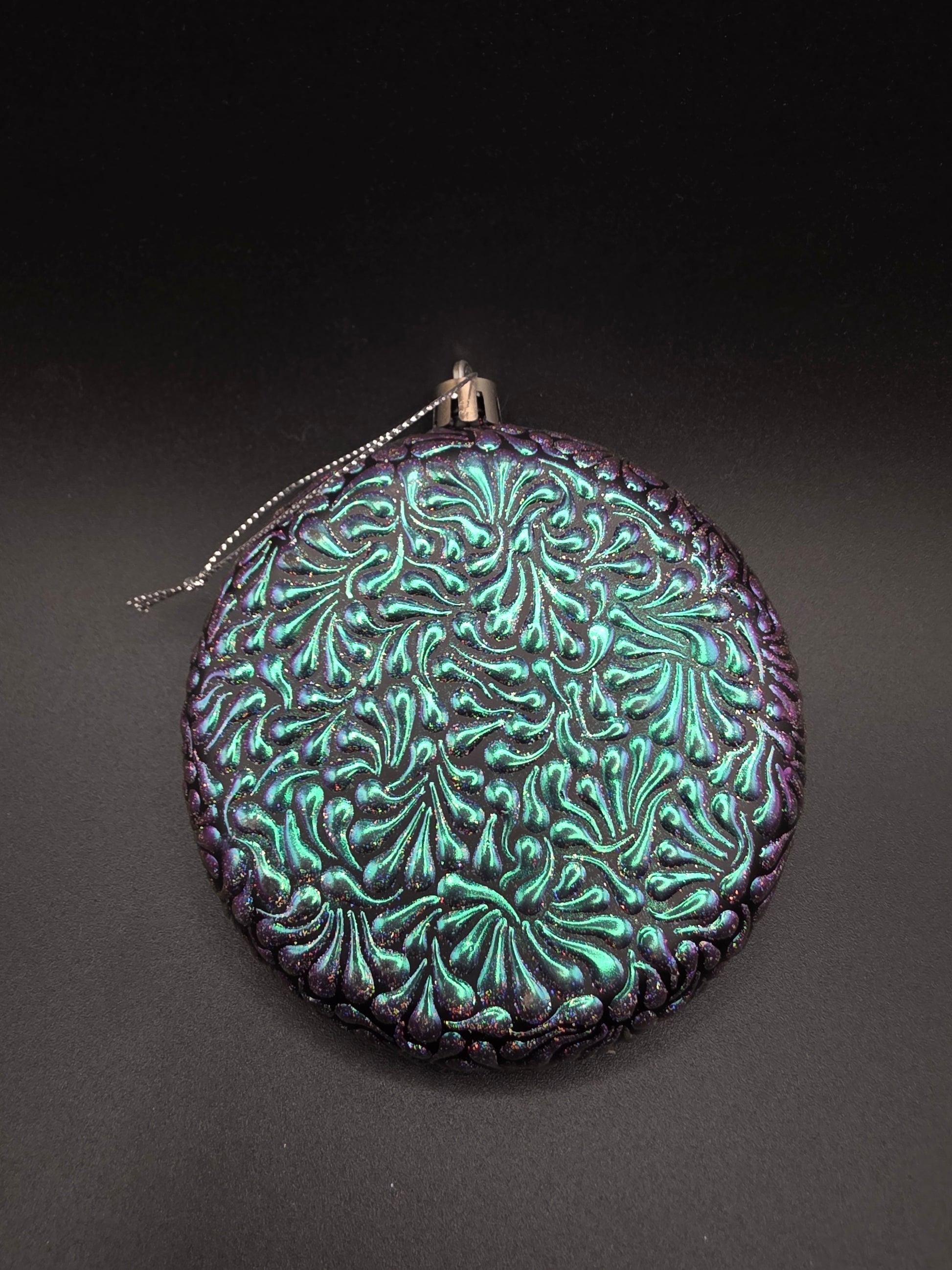 This bold ornament captivates with its striking purple and teal mica powder texture, sealed under a glossy varnish for enduring brilliance. Made from sturdy plastic, its double-sided design adds a daring splash of color and intrigue to any space, guaranteed to ignite curiosity and elevate your decor.
