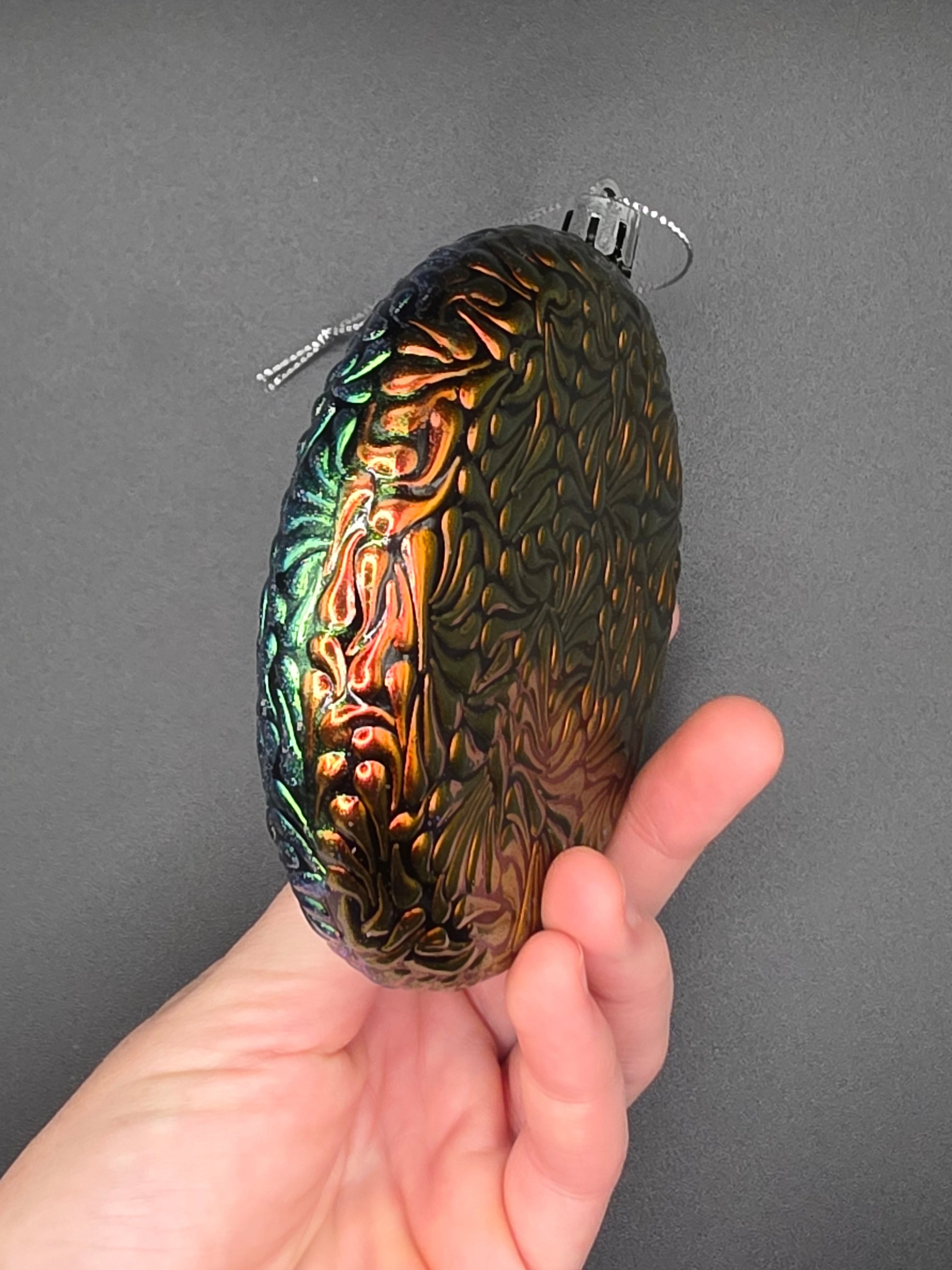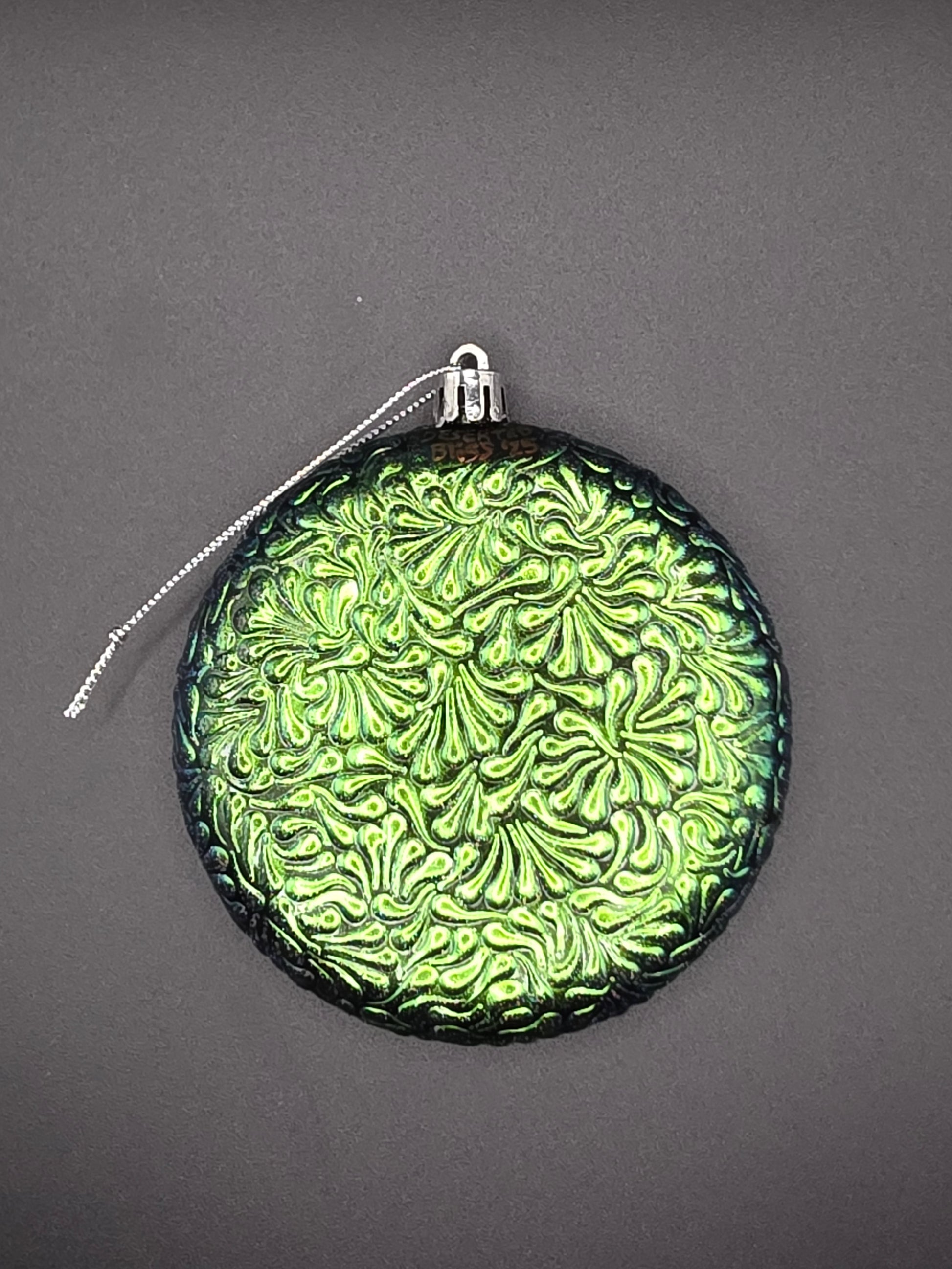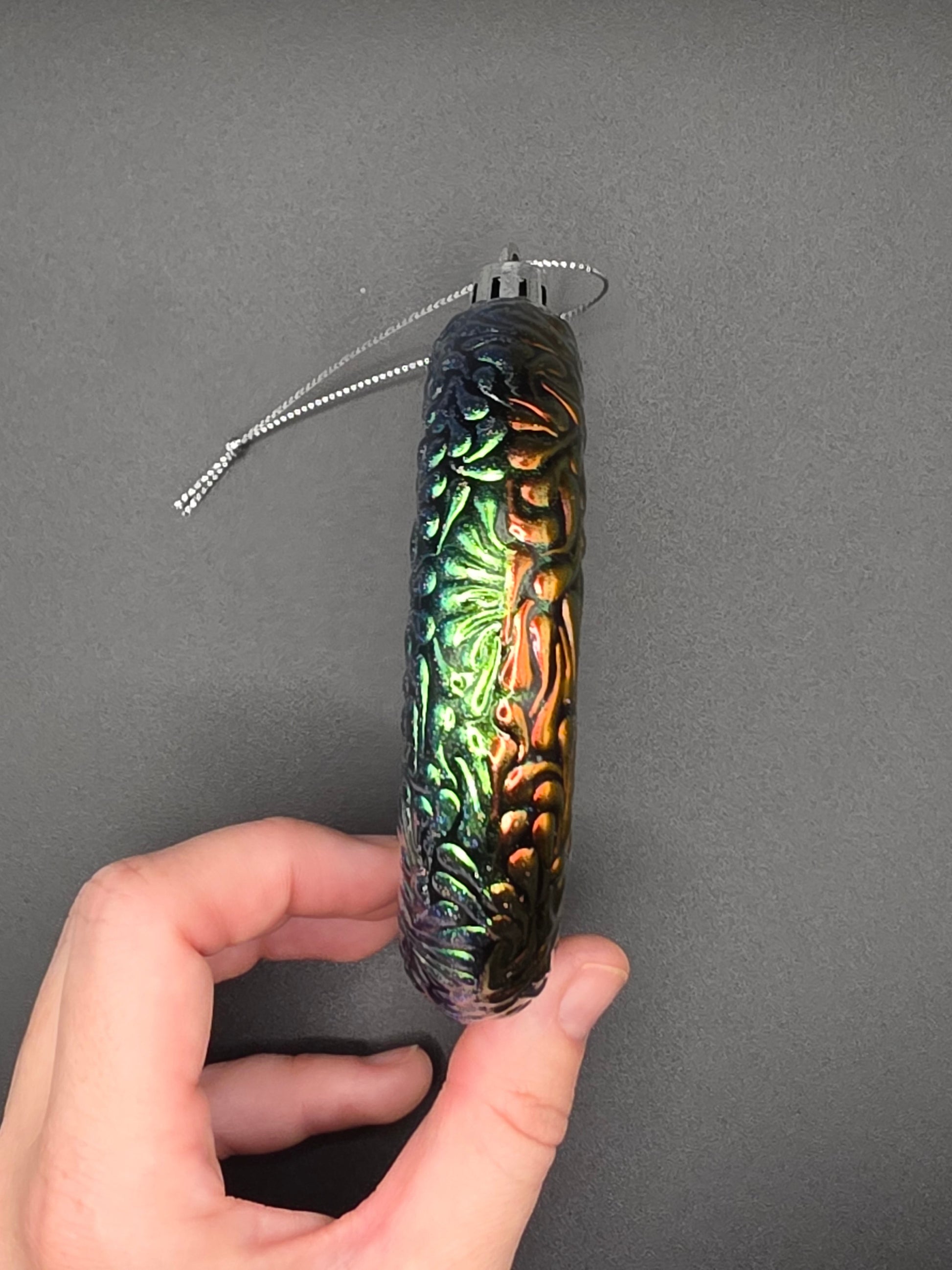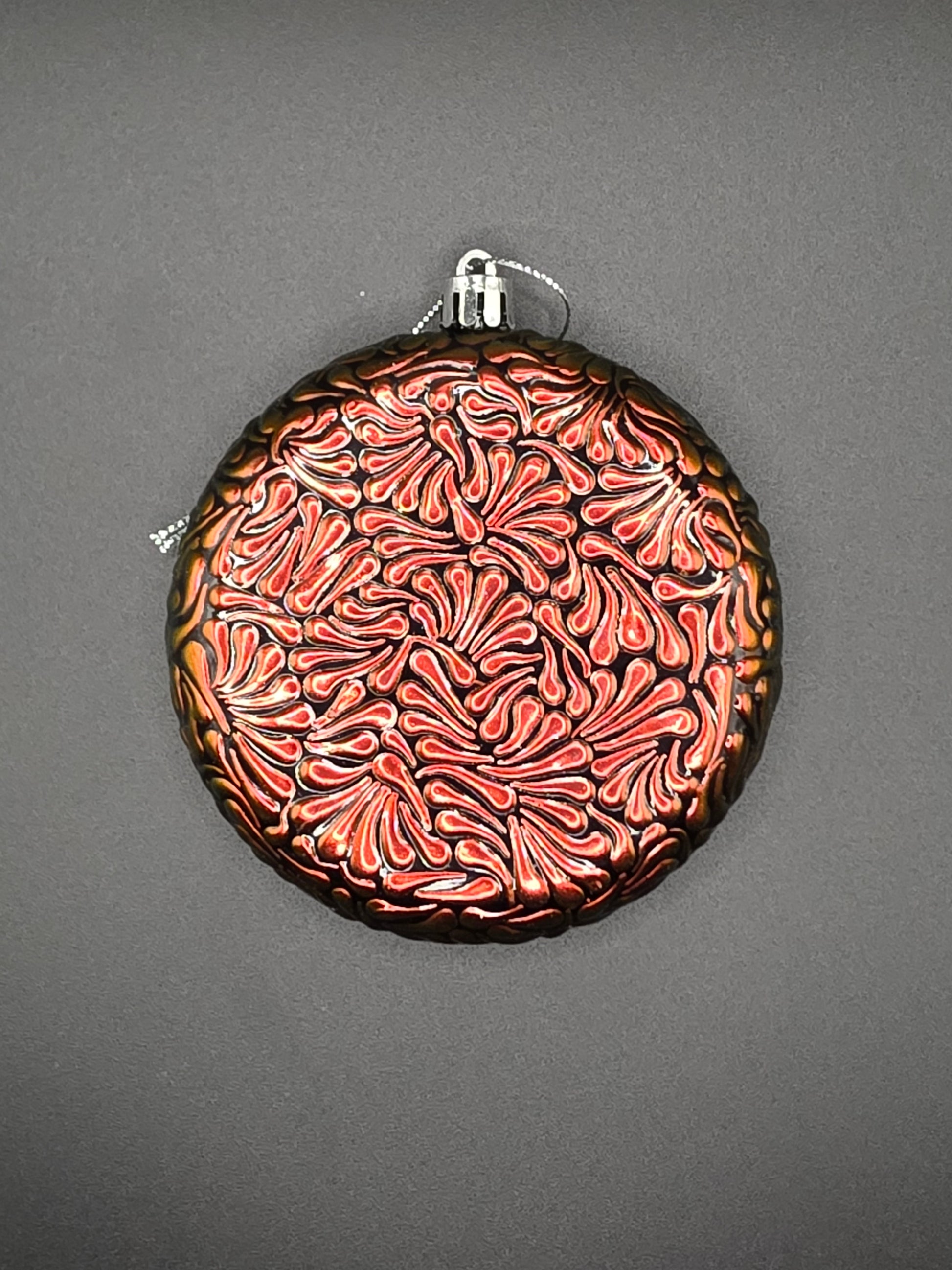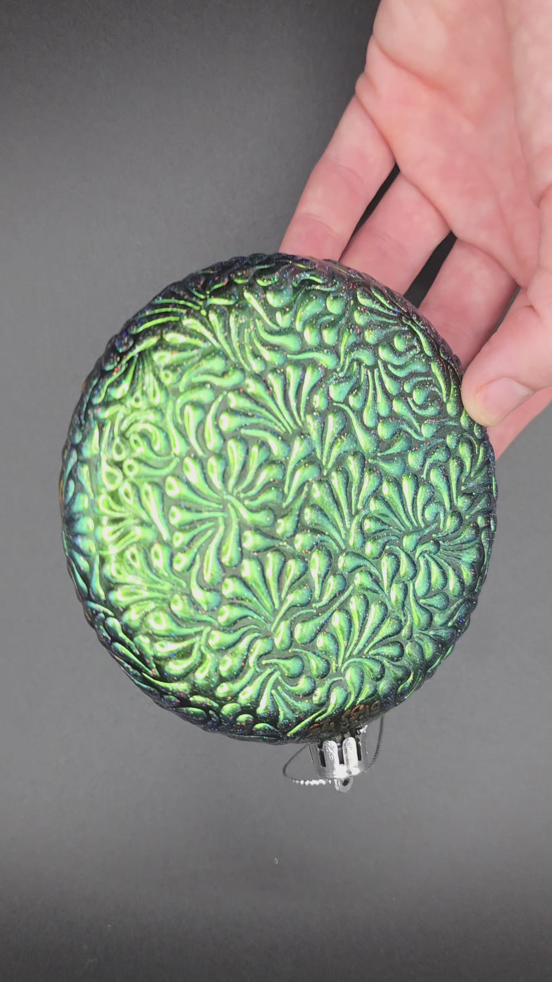 This bold ornament captivates with its unique texture swoosh design, sealed in a durable varnish for lasting shine. Crafted from sturdy plastic, it withstands the test of time. One side dazzles with a fiery reddish-orange shift, while the reverse reveals a cool blue-green glow, making it a striking statement piece from every angle.